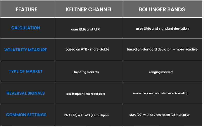 Both Keltner Channels and Bollinger Bands are valuable tools for analysing market conditions, but they serve different purposes:
