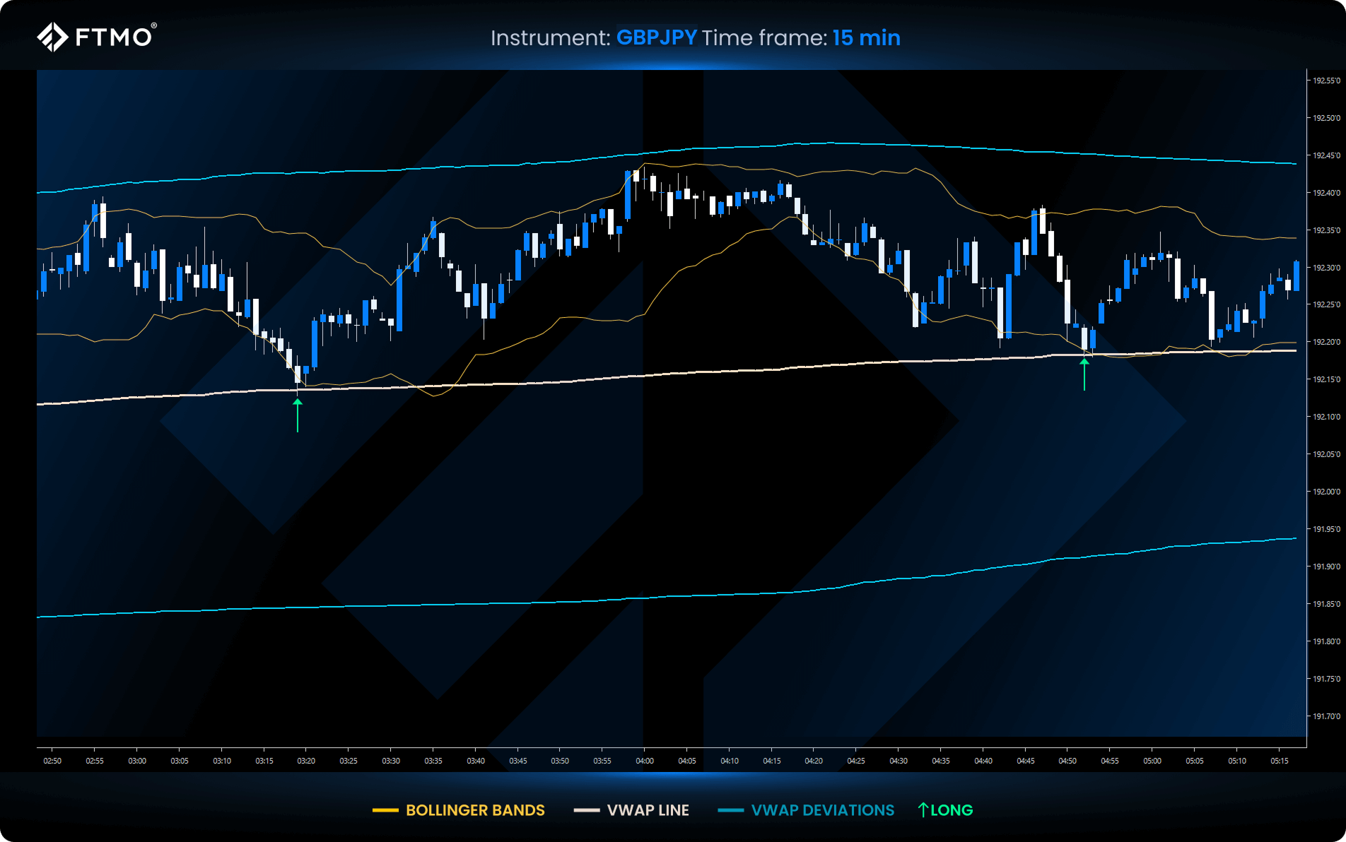 - Initiate long trades when the price reaches the lower Bollinger Band and VWAP deviation.